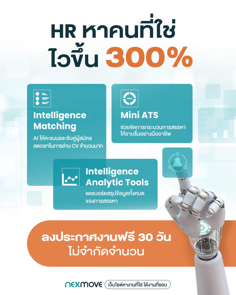 Nexmove คือเเพลตฟอร์มอัจฉริยะในการสรรหาบุคคล ซึ่งใช้เทคโนโลยี AI เข้ามาช่วยคัดเลือก เพื่อลดความยุ่งยากของกระบวนการสรรหา และทำให้การจ้างงานของคุณง่ายกว่าที่เคย